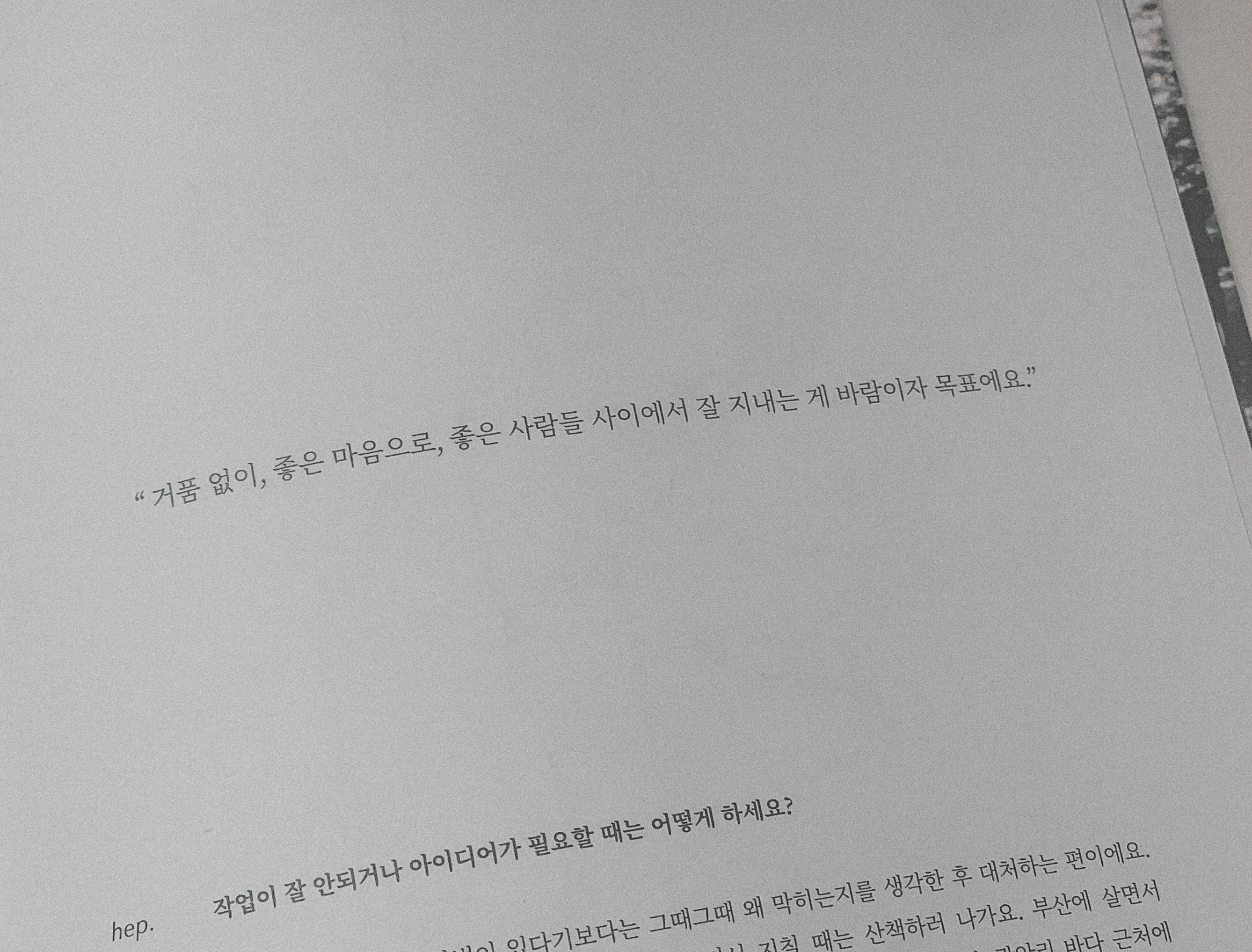 " 거품 없이, 좋은 마음으로, 좋은 사람들 사이에서 잘 지내는 게 바람이자 목표예요.". - Hep.p43